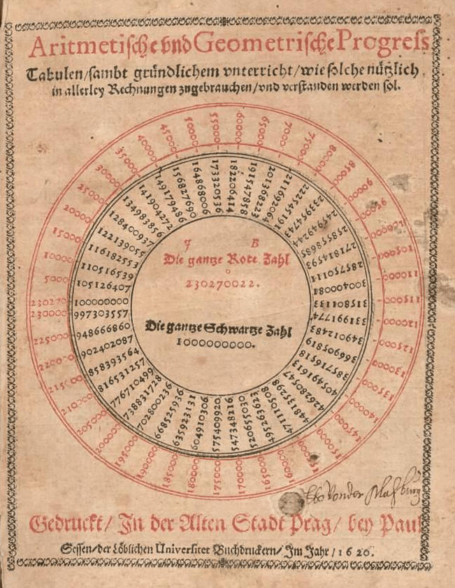 Logarithmen: Unabhängig von Napier entwickelte Bürgi eine Methode zur Vereinfachung von Berechnungen, die auf Logarithmen basierte. Seine Logarithmentabellen, die „Arithmetische und geometrische Progreßtabulen“ (1620), erschienen jedoch erst nach Napiers „Mirifici Logarithmorum Canonis“ (1614).