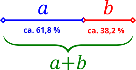 Nehmen wir an, die ganze Strecke habe die Länge 1 und ihr längeres Teilstück die Länge x, so führt vorige Forderung auf die Gleichung . Durch Multiplikation der Gleichung mit x erhalten wir daraus die quadratische Gleichung